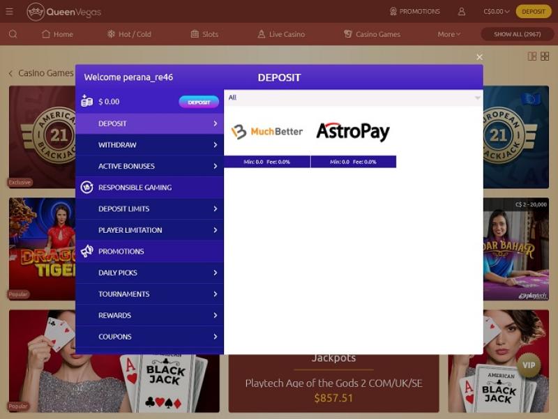 Queen Vegas 的银行服务种类繁多,网站提供多种电子钱包选项,用于存取款,以及信用卡和电汇交易。赌场的待处理时间为 24 小时,但电子钱包提款通常可在当天完成。