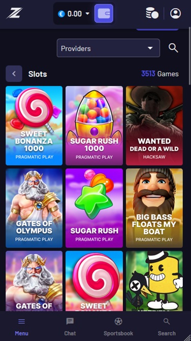 玩家可以使用网站左侧的垂直菜单访问客服聊天、活动、VIP俱乐部和帮助中心。在这里,他们还可以选择自己喜欢的赌博类型,包括赌场和体育博彩。选择后,用户将被转到一个包含所有产品类别和类型的专用页面。