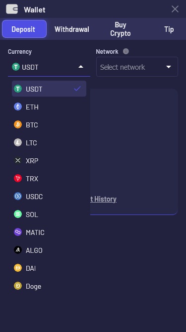 打开平台后,您将看到注册提示,并可轻松访问真人娱乐场和体育博彩版块。主页还显示加密货币商店,用户可以在其中以简洁直接的方式购买加密货币。