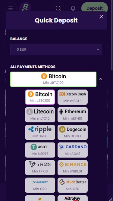 在主页的最底部,您可以看到在 Ready Casino 存款和取款时可以使用哪些付款方式,以及负责任赌博、条款和条件、客户支持、游戏规则和隐私政策等标准页面。