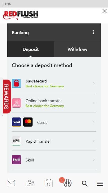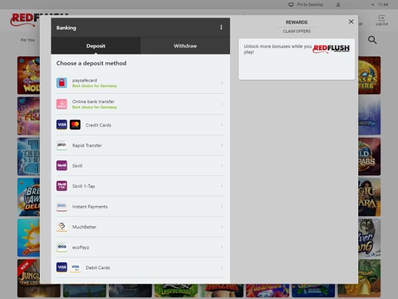 Red Flush 赌场由 Microgaming, Net Entertainment, Evolution Gaming, Triple Edge Studios, Stormcraft Studios, Switch Studios, Pulse 8 Studios, Games Global, Just For The Win and Fortune Factory Studios提供支持,提供数百款游戏以及一个托管赌场所有服务的卓越游戏平台。赌场可通过可下载的客户端软件或网页平台访问,两者的功能基本相同。此外,还提供移动赌场,方便那些想在智能手机或平板电脑上博彩的玩家。