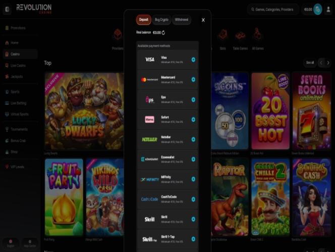 在银行选项方面,Revolution Casino 为玩家提供多种支付方式,例如Visa 、 Mastercard 、 Jeton 、 Neteller 、 Skrill 、 Neosurf 、Paysafecard 等。除了传统的银行选项外,玩家还可以选择使用比特币等加密货币进行存款和取款。