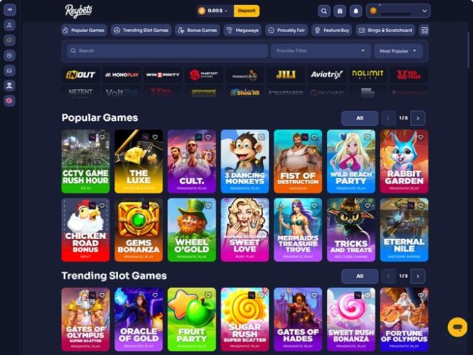 正如我们之前提到的,这家赌场拥有数千种不同的游戏。其中最受欢迎的游戏之一无疑是老虎机 ,它们占据了Reybets游戏库的绝大部分。无论您喜欢经典老游戏还是最新推出的热门游戏,您都不会失望。以下列举一些您可以在赌场体验到的游戏: