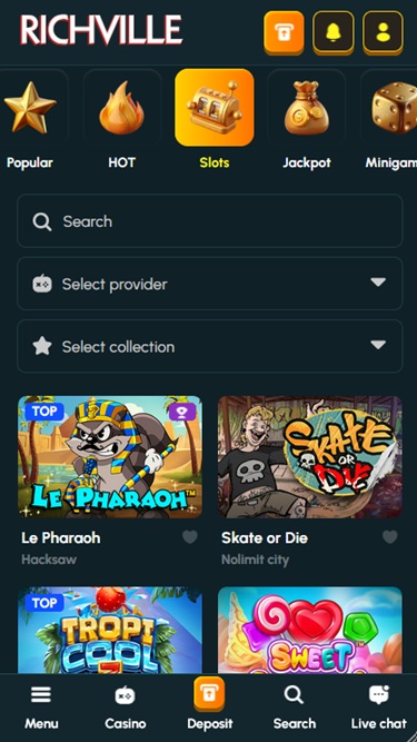 Instant Lucky 7、Skyward、Colors、Lines、Blocks、Aviatrix、Plinko、HiLo、Aviator、Mines、Hamsta 和 Neko等即时崩溃游戏也是 Richville 玩家非常受欢迎的选择,如果您喜欢玩规则和功能更简单的游戏,我们强烈建议您尝试一下。