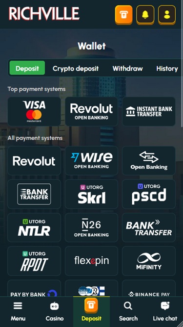 您可以通过多种方式在 Ricvhille 存取资金。该品牌接受多种传统支付方式,例如Visa 、 Mastercard 、银行电汇、 Google Pay 、 Apple Pay 、 Skrill 、 Neteller 、 Paysafecard等。加密货币爱好者也会感到满意,因为该品牌接受比特币、卡尔达诺、狗狗币、波卡币、以太坊、莱特币、 Solana 、 Tether 、瑞波币和USD Coin等加密货币。