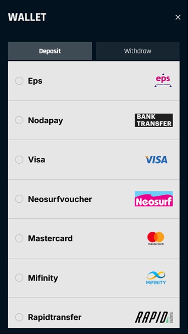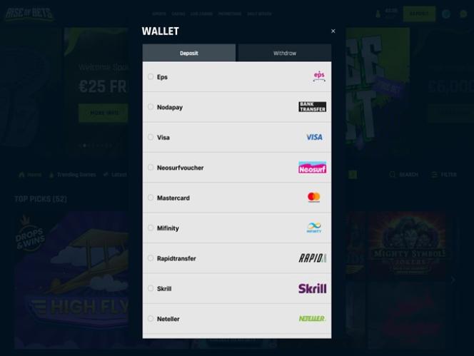 在 Rise of Bets Casino 进行存款和取款时,运营商允许玩家使用多种银行方式,例如Visa 、 Mastercard 、 Jeton 、 Mifinity 、 Neteller 、 Skrill 、 Paysafecard 、 Trustly 、 Payz和银行电汇。遗憾的是,该网站不接受加密货币,因此那些寻求加密货币体验的人必须另寻他处。