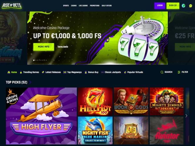 Rise of Bets 赌场是一家功能齐全的在线赌场,旨在为玩家提供完整的真钱赌博体验。玩家可以浏览数千款独特的赌场游戏,包括众多在线老虎机、桌面游戏、真人荷官以及一些原创游戏。此外,该网站还提供海量体育博彩,提供丰富的体育博彩选项和虚拟体育赛事。
