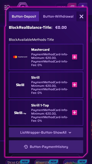 当然,您也可以选择使用更传统的方法,无论是 Skrill 和 Neteller 等电子钱包,还是老式的万事达卡;选择权完全取决于您!