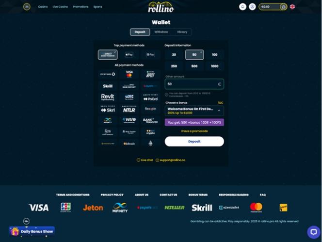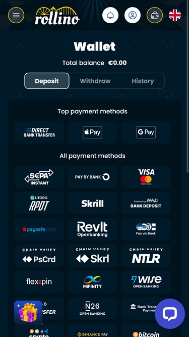 收银员支持多种广泛使用的支付方式,包括信用卡和借记卡、电子钱包(如Neteller 和 Skrill) 、加密货币支付和其他流行的网上银行选项。