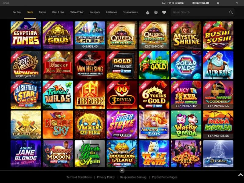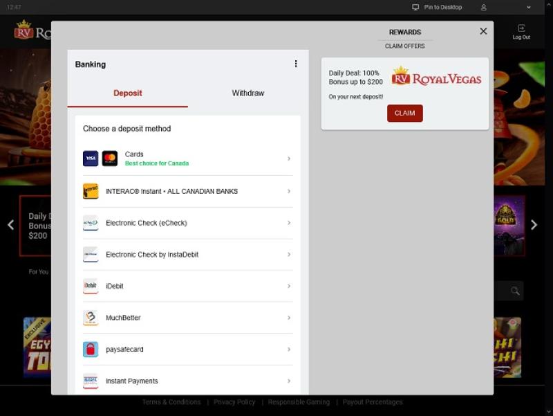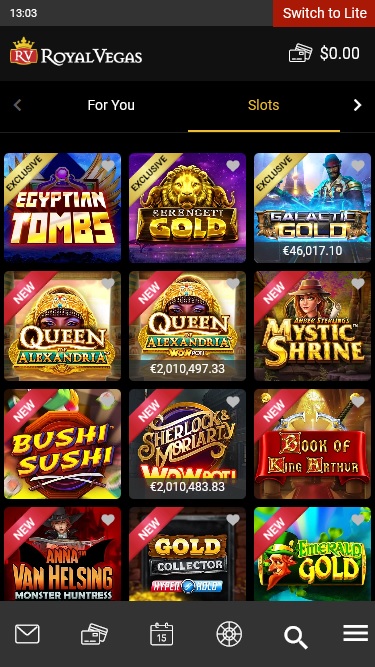 皇家维加斯赌场由 Microgaming, Net Entertainment, Evolution Gaming, Rabcat, Pragmatic Play, Red Tiger Gaming, Triple Edge Studios, Northern Lights Gaming, Stormcraft Studios, Switch Studios, Electric Elephant Games, All41 Studios, Gameburger Studios, Pulse 8 Studios, Neon Valley Studios, SpinPlay Games, Real Dealer Studios, GONG Gaming, On Air Entertainment, Buck Stakes Entertainment, Games Global, OpenBet, Old Skool Studios, Foxium, Just For The Win, PearFiction Studios, Wild Streak Gaming, Slingshot Studios, Fortune Factory Studios, Crazy Tooth Studio, Alchemy Gaming, Snowborn Games, Gold Coin Studios, Half Pixel Studios, Eurostar Studios and Aurum Signature Studios提供支持,为玩家提供数百种赌场游戏选择。您可以通过可下载的客户端软件以及基于 Flash 的平台访问赌场,后者允许您在网页浏览器中畅玩游戏。