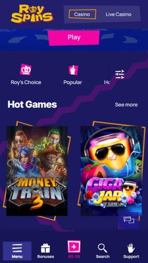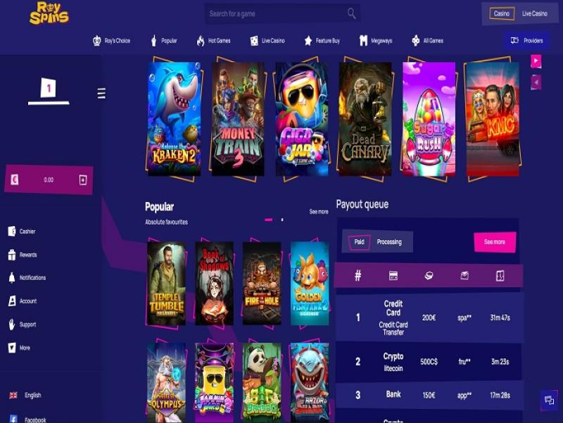 Royspins Casino 提供海量在线老虎机游戏,包括 Temple Tumble Megaways、Book of Shadows、Money Train 2 和 Jammin Jars,以及 Elvis Frog In Vegas、Big Bamboo、Fire in The Whole 等众多游戏。