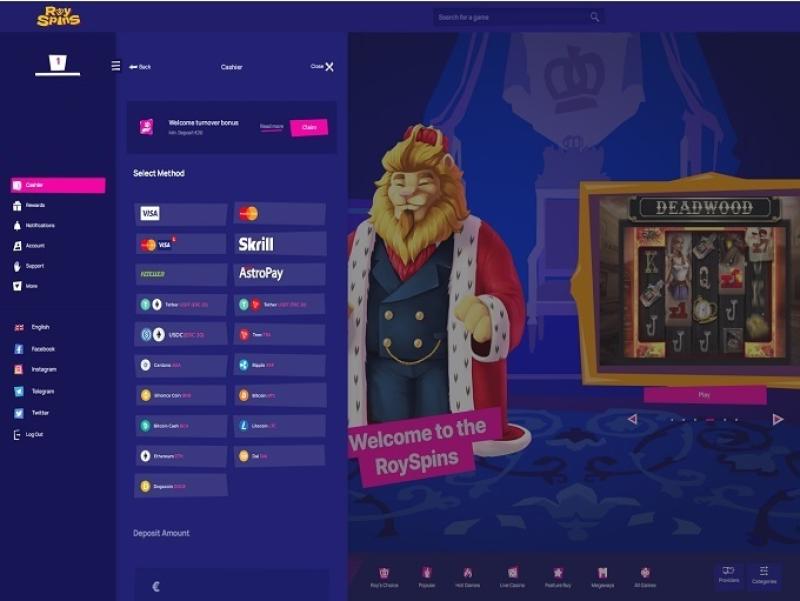 在 Royspins 赌场玩游戏的优势之一是,您可以选择多种支付方式。我们提供多种流行的银行服务,例如 Visa、MasterCard、Skrill、Neteller、ecoPayz、Jeton、Neosurf、Paysafecard 等。我们也鼓励玩家使用加密货币进行交易。