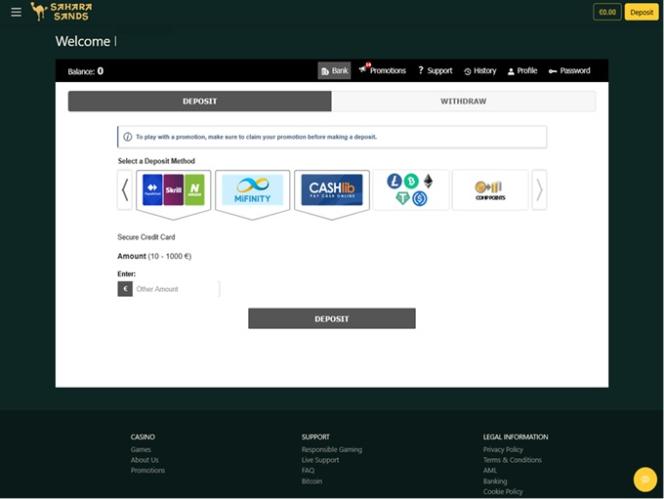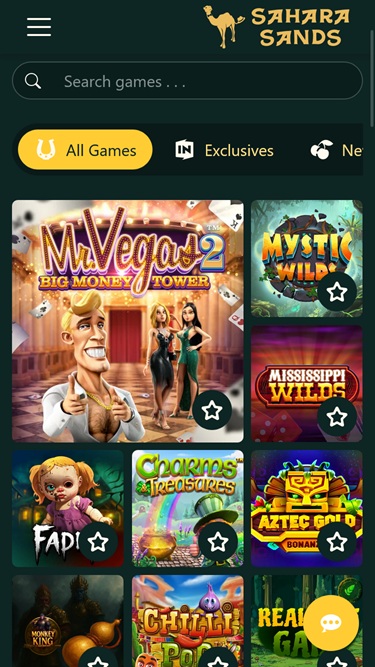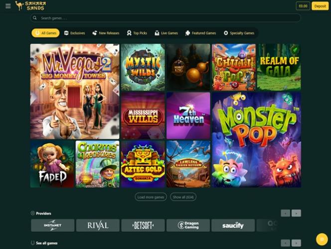 Sahara Sands 赌场由 BetSoft, Genesis Gaming, Rival, Saucify, Vivo Gaming, Spinomenal, Felix Gaming, Fugaso, Radi8 Games, Fresh Deck Studios, Woohoo Games, Qora Games, SmartSoft Gaming, Tom Horn Gaming, Genii, Wager Gaming, Dragon Gaming and Dragoon Soft提供支持,拥有丰富的老虎机、桌面游戏、视频扑克和室内游戏库。您可以通过下载的软件访问赌场,也可以通过网页浏览器进行即时游戏。