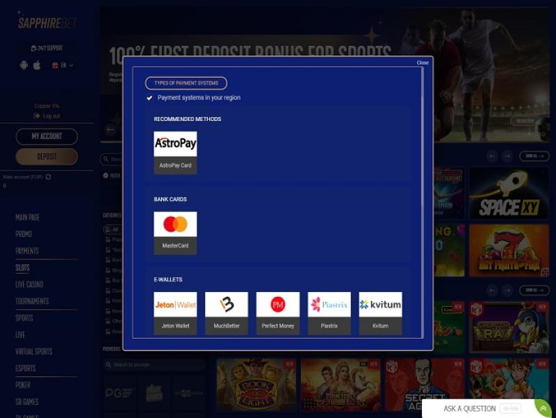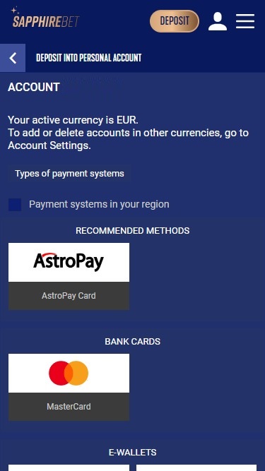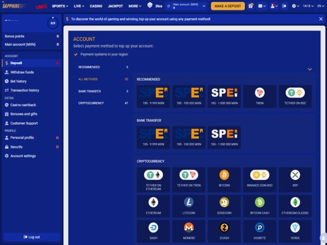 为了从赌场账户中存入和提取资金,Sapphirebet 的玩家可以使用多种银行选项,包括Visa 、 Mastercard 、 Jeton 、 Neosurf 、 Payz 、 Flexepin 、 MuchBetter 、 Paytm 、 Astropay ,以及多种加密货币,如比特币、比特币现金、卡尔达诺、狗狗币、 Polkadot 、以太坊、莱特币、 Tron 、 USD Coin 、 Tether 、 Ripple