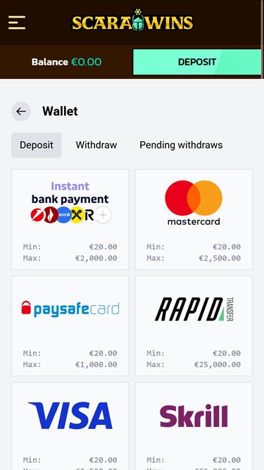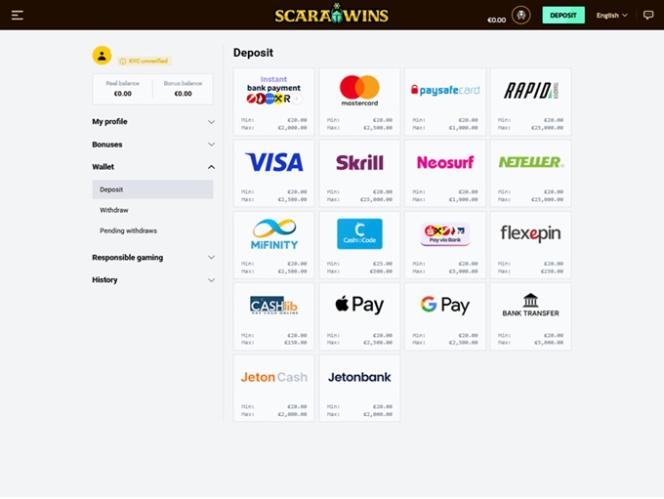 对于那些想知道 Scarawins 赌场是否接受加密货币的人来说,很遗憾,答案是否定的。但他们的财务部门提供几种流行的银行支付方式,包括 Apple Pay、银行电汇、 MiFinity 、Skrill、Neteller、Visa 和 MasterCard 等等。