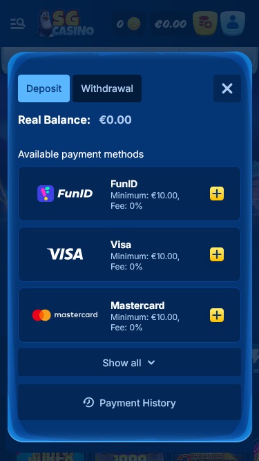在银行业务方面,SG Casino 提供多种存款解决方案。玩家可以选择使用加密货币支付,因为加密货币近年来非常流行。此外,还有万事达卡、Sticpay、AstroPay等主流支付方式。如果玩家愿意,还可以选择通过 Neosurf 存款。