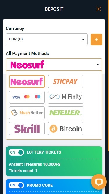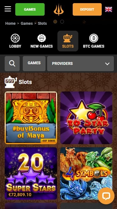 游戏分为多个有序的部分:老虎机、BTC 游戏、累积奖金、视频扑克、彩票、真人娱乐场……
