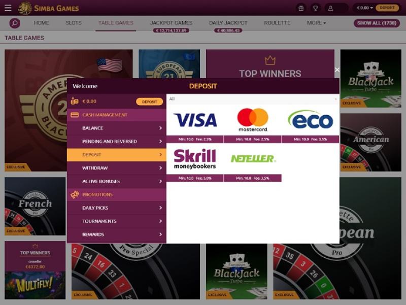 纵观 Simba Games Casino 的条款和条件,没有任何明显的不公平或掠夺性内容。银行服务支持 Visa、MasterCard、Neteller、Skrill、EntroPay、PayPal、电汇、Poli 等多种方式进行存款和取款。银行服务时效极佳,电子钱包当天即可完成,信用卡和电汇也只需 2-7 个工作日即可完成。需要注意的是,每月提款限额为 10,000 美元。