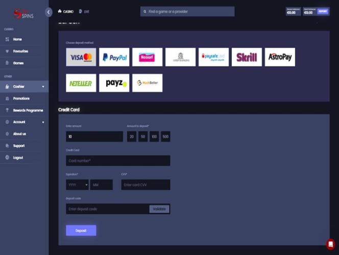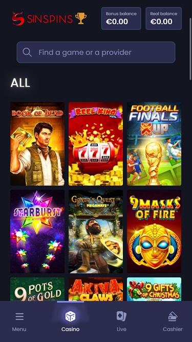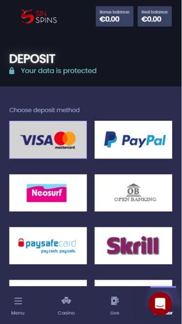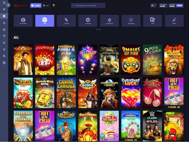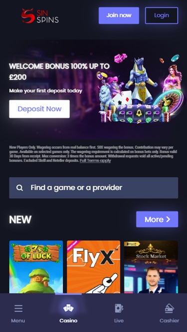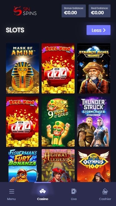 Sin Spins 赌场由 Microgaming, Net Entertainment, Playtech, 1x2gaming, Barcrest, Big Time Gaming, ELK Studios, Evolution Gaming, EYECON, lightningboxgames, Novomatic, Play'n GO, Rabcat, Thunderkick, Wazdan, Nolimit City, Red Tiger Gaming, Spinomenal, SYNOT Games, Skywind, Triple Edge Studios, Northern Lights Gaming, Stormcraft Studios, Switch Studios, All41 Studios, Gluck Games, Gameburger Studios, Pulse 8 Studios, Slot Factory, Neon Valley Studios, Shuffle Master, SpinPlay Games, Real Dealer Studios, GONG Gaming, On Air Entertainment, Buck Stakes Entertainment, Games Global, Blueprint Gaming, Greentube, Tom Horn Gaming, WMS, Inspired Gaming, SG Interactive, Red7Mobile, CORE Gaming, Scientific Games, Reel Time Gaming, Iron Dog Studio, Old Skool Studios, Foxium, Betdigital, Just For The Win, PearFiction Studios, Wild Streak Gaming, Slingshot Studios, Fortune Factory Studios, Gamevy, Crazy Tooth Studio, Alchemy Gaming, Black Pudding Games, Snowborn Games, Hacksaw Gaming, Gold Coin Studios, Half Pixel Studios, Aurum Signature Studios, Lucksome Gaming, Area Vegas, Wishbone Games, Circular Arrow, HammerTime Games, INO Games, Nailed It! Games, Neko Games, Reel Kingdom, Oros Gaming and Light & Wonder提供支持,其游戏通过基于网页的即时游戏平台提供,用户可以通过其网页即时游戏平台注册、存款并畅玩游戏。该赌场还支持移动端游戏,您可以通过智能手机或平板电脑进行游戏。Baccarat