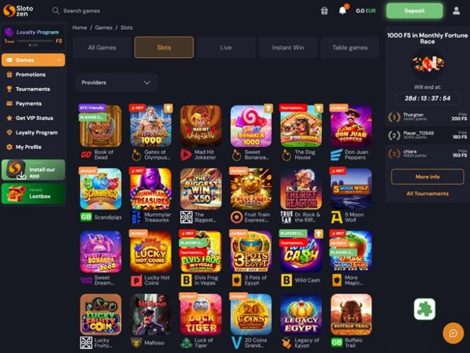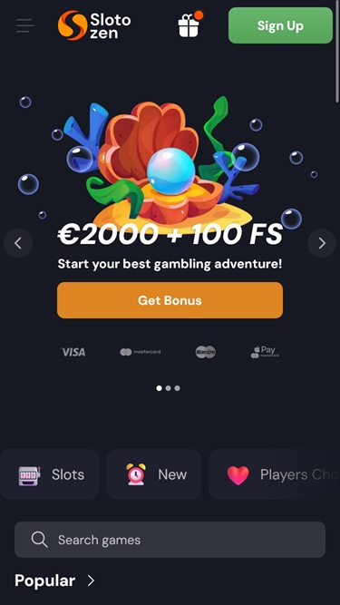 Slotozen 是一个在线博彩品牌,其平台设计简洁明了。赌场采用了流行的布局,在页面标题下方有一个幻灯片。幻灯片当然会展示最具吸引力的促销优惠。主页的中央部分专门用于展示 Slotozen 丰富的游戏优惠,页脚区域则用于提供有关赌场服务和规则的更多信息。