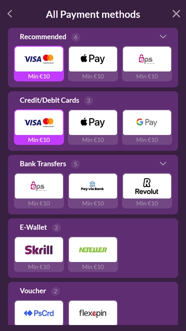 该平台提供全球顶级银行方式的存款和取款服务,包括 Apple Pay、银行电汇、Google Pay、Interac、NETELLER、Rapid Transfer、Revolut、Ripple、Skrill、支付卡和其他网上银行系统 ……