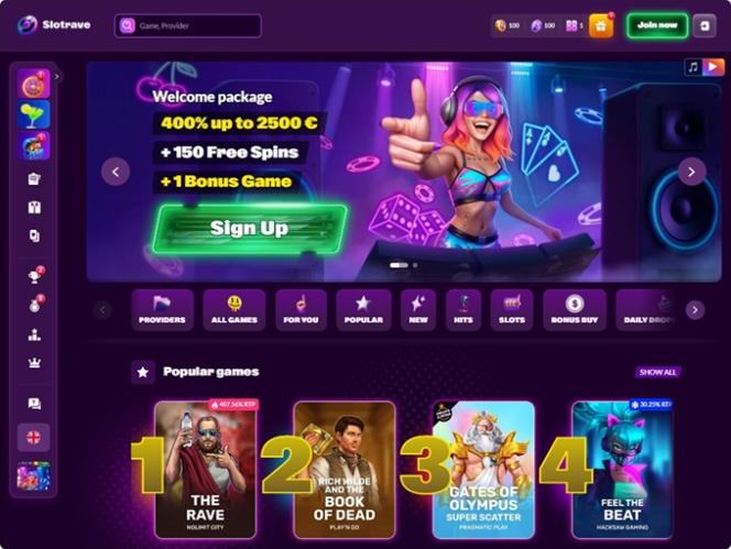 Slotrave Casino是一家主要面向加拿大 、德国、瑞士和奥地利 玩家的在线赌场。该网站界面精美生动,并提供捷克语、德语、希腊语、英语、西班牙语、法语、匈牙利语等多种语言版本。