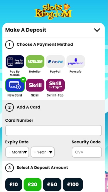 Slots Kingdom 赌场由 Microgaming, Net Entertainment, Playtech, 1x2gaming, Barcrest, Big Time Gaming, ELK Studios, EYECON, lightningboxgames, Oryx, Play'n GO, playson, Quickspin, Saucify, Thunderkick, Wazdan, Realistic Games, Booming Games, Pragmatic Play, Nolimit City, Red Tiger Gaming, Spinomenal, Red Rake Gaming, Fantasma Games, Spin Games, Triple Edge Studios, Northern Lights Gaming, Stormcraft Studios, Switch Studios, Bulletproof Games, All41 Studios, Gluck Games, Gameburger Studios, Pulse 8 Studios, Neon Valley Studios, Golden Rock Studios, Shuffle Master, SpinPlay Games, Real Dealer Studios, GONG Gaming, Blue Guru Games, On Air Entertainment, Buck Stakes Entertainment, Design Works Gaming, Games Global, 2by2 Gaming, Ainsworth, Ash Gaming, Bally Technologies, bluberi, Blueprint Gaming, Jumpman Gaming, Leander Games, Merkur Gaming, NextGen, Tom Horn Gaming, Inspired Gaming, Gaming Realms, Genii, SG Interactive, Gamomat, Red7Mobile, Scientific Games, Reel Time Gaming, Authentic Gaming, Iron Dog Studio, Old Skool Studios, Foxium, Betdigital, Just For The Win, The Games Company, Storm Gaming Technology, MetaGU, PearFiction Studios, Wild Streak Gaming, Slingshot Studios, Fortune Factory Studios, Jade Rabbit Gaming, 4ThePlayer, AvatarUX, Gamevy, Crazy Tooth Studio, ReelPlay, Alchemy Gaming, Rarestone Gaming, Snowborn Games, Boomerang Studios, Hacksaw Gaming, Max Win Gaming, Gold Coin Studios, Half Pixel Studios, Peter And Sons, Aurum Signature Studios, Lucksome Gaming, Area Vegas, RAW iGaming, Wishbone Games, HammerTime Games, INO Games, Nailed It! Games, Atomic Slot Lab, Neko Games, Reel Kingdom, Oros Gaming and Light & Wonder提供支持,并通过基于网页的即时游戏平台提供游戏。这意味着赌场可以直接通过您的网页浏览器加载,无需下载。该赌场还全面支持移动端游戏,您可以在智能手机或平板电脑上畅玩游戏。