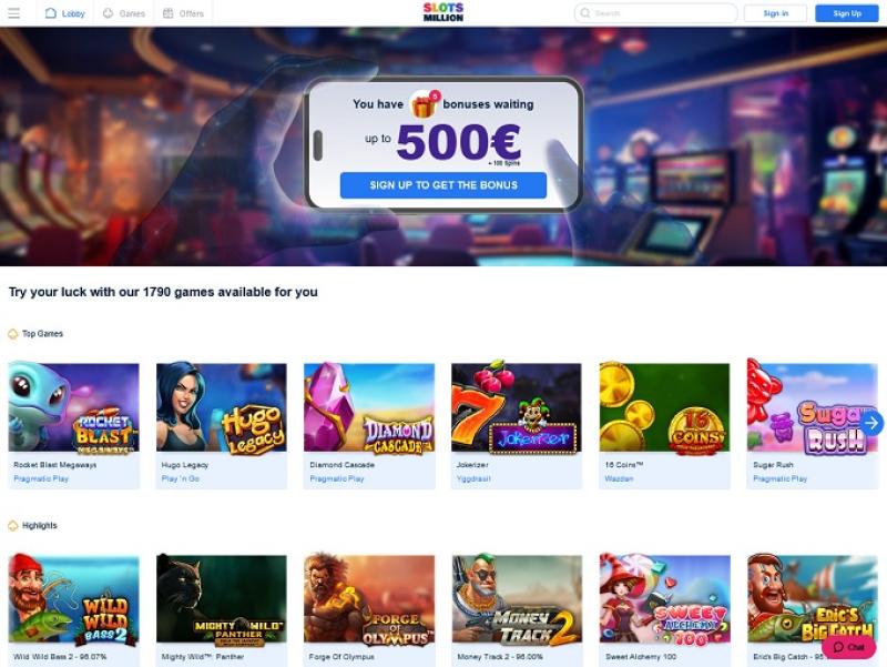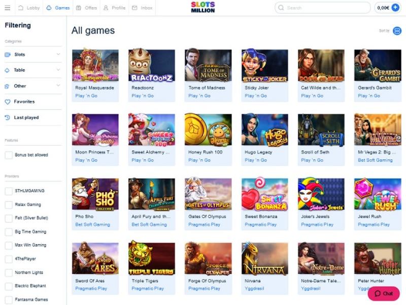 SlotsMillion 赌场由 BetSoft, Amatic Industries, Big Time Gaming, Play'n GO, Relax Gaming, Yggdrasil, Wazdan, Stakelogic, Pragmatic Play, Felt Gaming, Fugaso, Fantasma Games, Northern Lights Gaming, Electric Elephant Games, Blue Guru Games, Storm Gaming Technology, Wild Streak Gaming, Jade Rabbit Gaming, STHLM Gaming, 4ThePlayer, AGS Interactive, Max Win Gaming, SilverBack Gaming and Peter And Sons提供支持,为玩家提供超过一千种不同的游戏。这些游戏通过网络平台提供,您可以直接通过网络浏览器畅玩。无需下载。