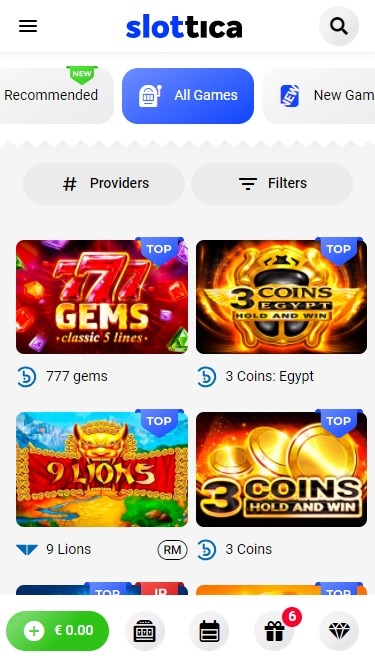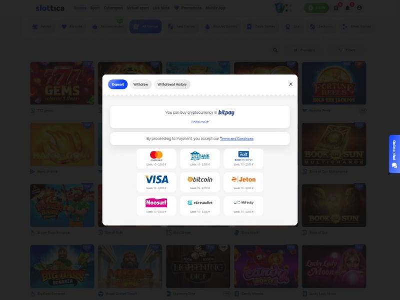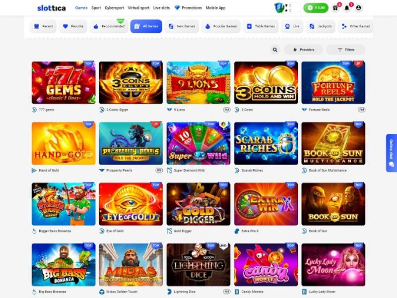 正如预期的那样,Slottica 提供了许多受欢迎且引人入胜的老虎机冒险,但赌场还在所有可用类别中为赌客提供了许多赌博刺激:游戏、体育、电子竞技、虚拟体育和现场老虎机。