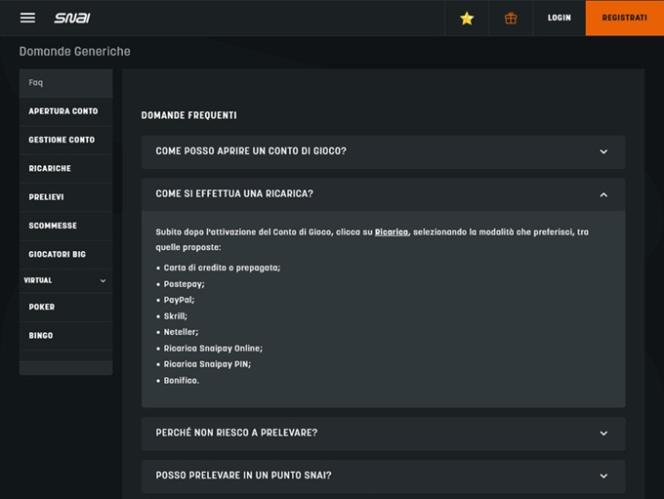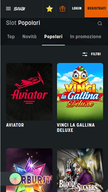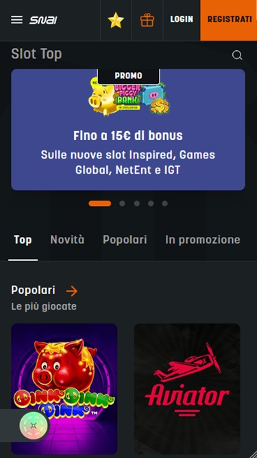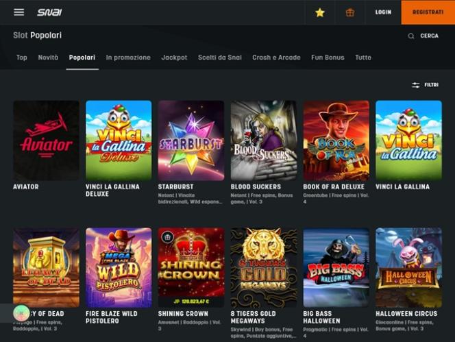 SNAI 由 Microgaming, Net Entertainment, Playtech, BetSoft, 1x2gaming, Barcrest, Big Time Gaming, ELK Studios, Espresso Games, Evolution Gaming, Habanero Systems, iSoftBet, lightningboxgames, Novomatic, Oryx, Play'n GO, playson, Quickspin, Rabcat, Relax Gaming, Thunderkick, WM, Yggdrasil, Endorphina, GameArt, Booming Games, Pragmatic Play, Nolimit City, Red Tiger Gaming, IGT, Fantasma Games, SYNOT Games, Skywind, Spinmatic, Triple Edge Studios, Fazi, Stormcraft Studios, Pocket Games Soft, All41 Studios, Gluck Games, Gameburger Studios, Neon Valley Studios, Shuffle Master, SpinPlay Games, SmartSoft Gaming, Eurasian Gaming, Games Global, Amusnet Interactive, Ash Gaming, Bally Technologies, Blueprint Gaming, Greentube, Leander Games, Merkur Gaming, NextGen, WMS, Inspired Gaming, Gaming Realms, SG Interactive, Gamomat, Red7Mobile, Scientific Games, Reel Time Gaming, Capecod Gaming, Foxium, Betdigital, Just For The Win, PearFiction Studios, Wild Streak Gaming, Fortune Factory Studios, RubyPlay, 4ThePlayer, AvatarUX, Gamevy, ReelPlay, Rarestone Gaming, Snowborn Games, Lucksome Gaming, Area Vegas, RAW iGaming, Spribe, Nailed It! Games, Reel Kingdom, Nazionale Elettronica and Light & Wonder提供支持,赌场游戏由基于网页的即时游戏平台提供支持,可直接通过您的网络浏览器加载。无需下载繁琐的软件到您的电脑。该网站还支持手机游戏,您可以通过智能手机和平板电脑畅玩。