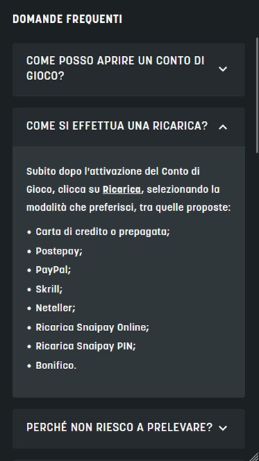 SNAI 为意大利人提供博彩服务的历史悠久。该公司最初是一家体育博彩公司,后来扩展到为客户提供彩票、宾果游戏和赌场游戏。SNAI 已获得意大利官方批准,是您在意大利能找到的最佳选择之一。它提供快速的赔付、良好的玩家回报率 (RTP) 统计,并为玩家提供每日旋转奖励。如果您在意大利,SNAI 绝对值得考虑。