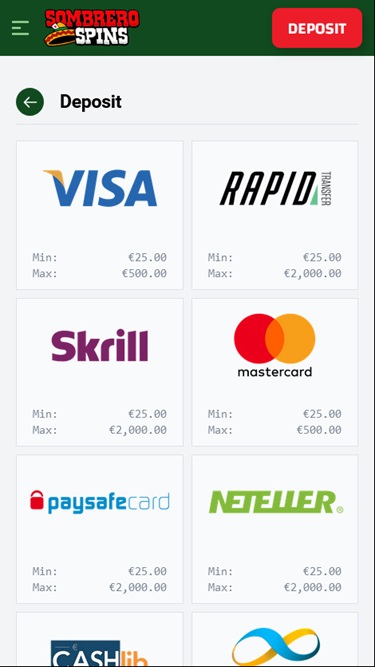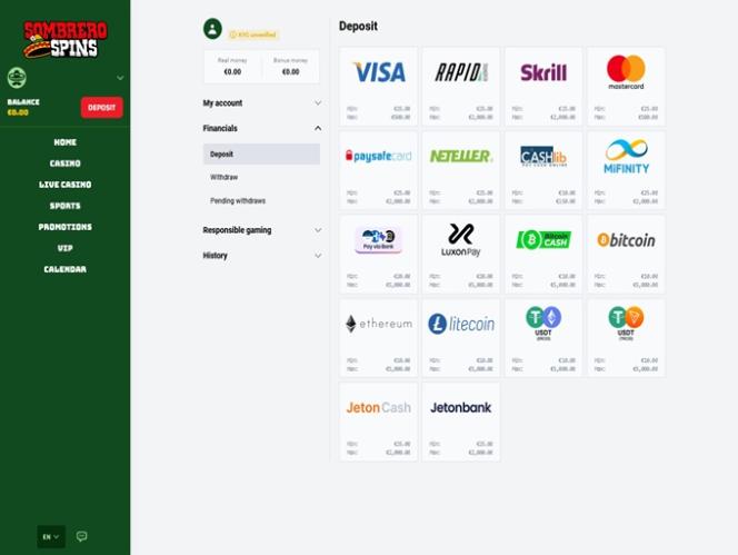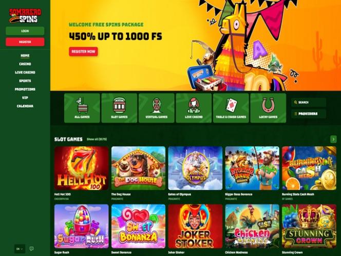 在促销和奖金方面,Sombrero Spins 拥有完善的促销计划,让玩家从中获益良多。新注册账户的玩家,无论喜欢玩赌场游戏还是体育博彩,首次存款即可获得丰厚的迎新礼包。