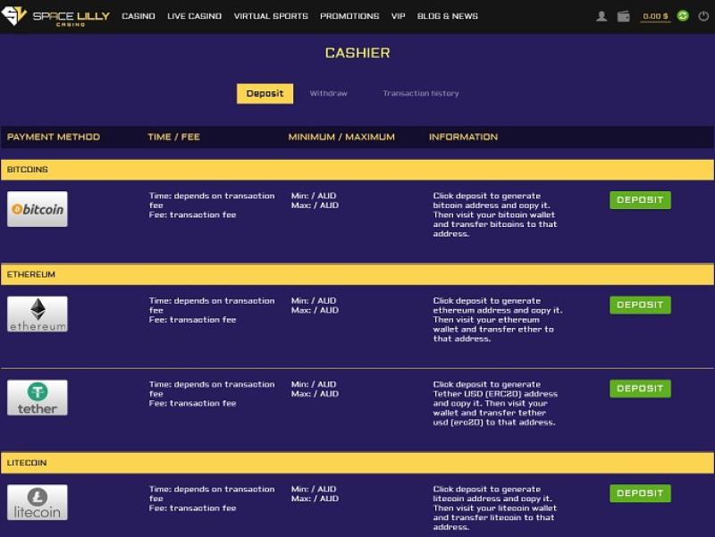 Space Lilly 的银行系统相当不错,甚至可以说是相当出色。赌场接受通过电汇、万事达卡、Skrill、Neteller、Paysafecard、Visa、ecoPayz 和 iDebit 进行存款和取款。提款需要 48 小时才能到账,电子钱包可在 24 小时内到账,其他方式则需要 2-4 个工作日左右到账。