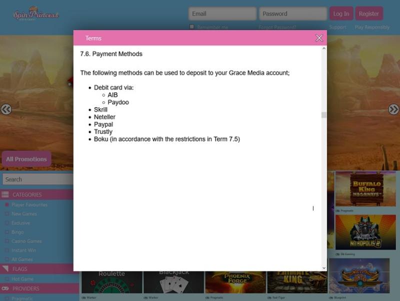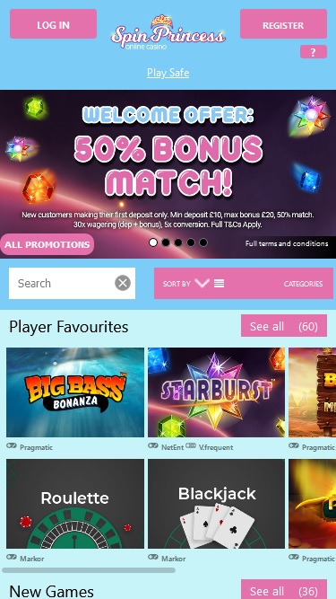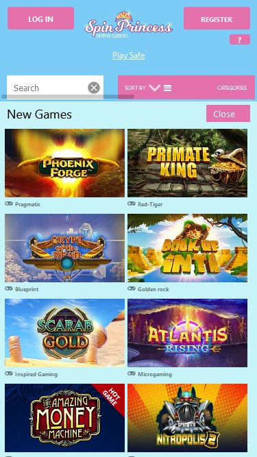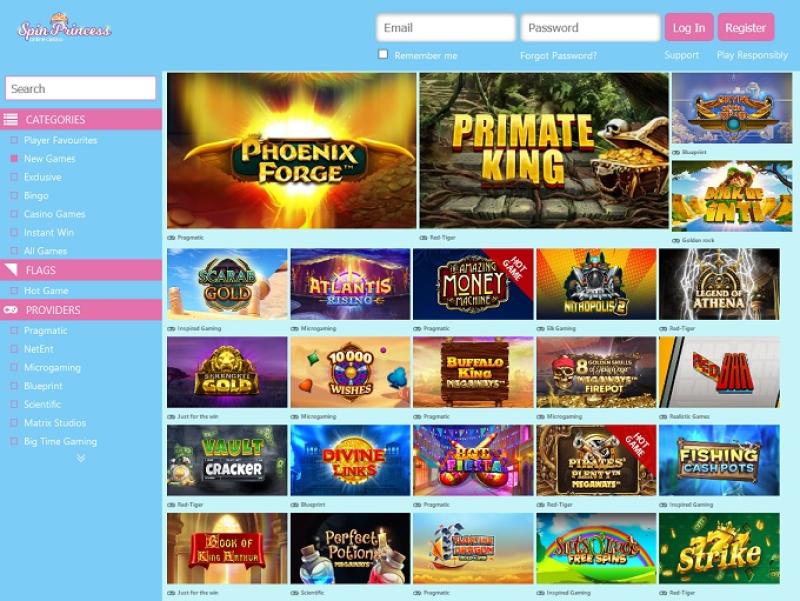 Spin Princess Casino 由 Microgaming, Net Entertainment, Big Time Gaming, ELK Studios, EYECON, lightningboxgames, Yggdrasil, Realistic Games, Pragmatic Play, Red Tiger Gaming, IGT, Skillzzgaming, Golden Rock Studios, SpinPlay Games, Games Global, Blueprint Gaming, Merkur Gaming, Nektan, NextGen, NYX Interactive, Inspired Gaming, SG Interactive, Scientific Games, Iron Dog Studio, Foxium, Just For The Win, Rocksalt Interactive, 4ThePlayer, Gamevy, Crazy Tooth Studio and ReelFeel Gaming提供支持,该公司通过基于网络的平台提供游戏,并且该赌场还拥有一个允许在智能手机和平板电脑上玩游戏的移动网站。