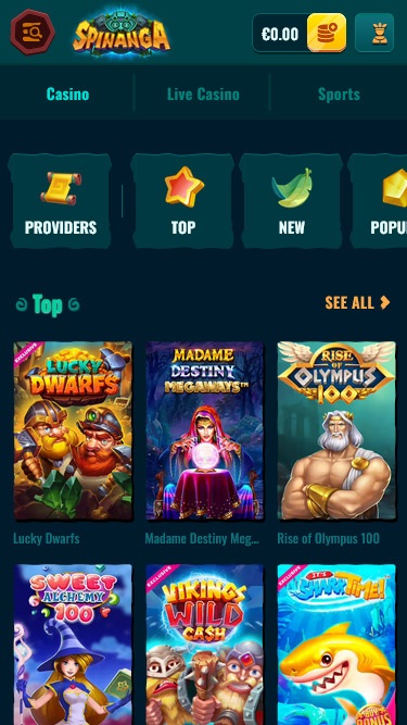 赌场的合作伙伴名单上,除了大牌游戏公司外,也有一些规模较小的工作室。这很有益,因为它丰富了游戏的多样性,并提升了游戏库的价值。在 Spinanga,玩家可以探索各种热门游戏,这些游戏被精心划分为以下类别:供应商、热门游戏、新游戏、热门游戏、独家游戏、真人游戏、老虎机、桌面游戏和所有游戏。