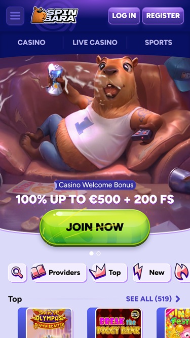 您一进入网站,就会看到一只栩栩如生的水豚懒洋洋地躺在沙发上,享受着冰镇汽水。这奠定了整个网站的基调,并强调了您可以足不出户,舒适地探索赌场所有功能的理念,这是一个非常贴心的小细节。