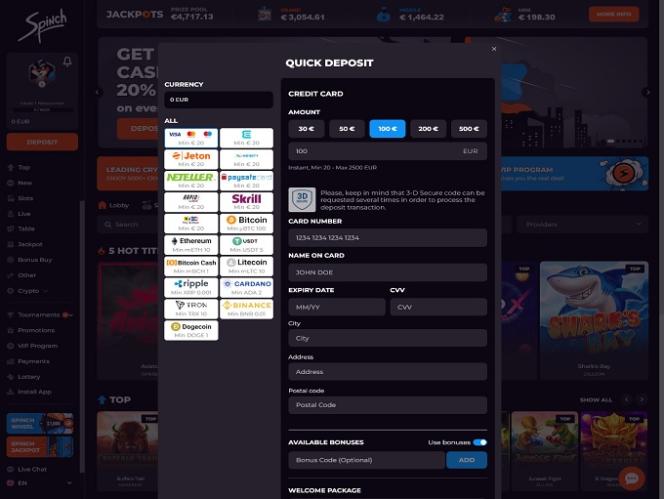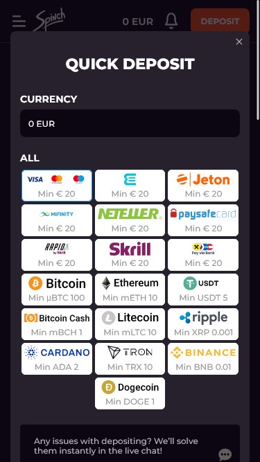 从Skrill 和 Neteller等流行的电子钱包到一些最热门的加密支付选项,Spinch Casino 支持多种存款和取款方式:
