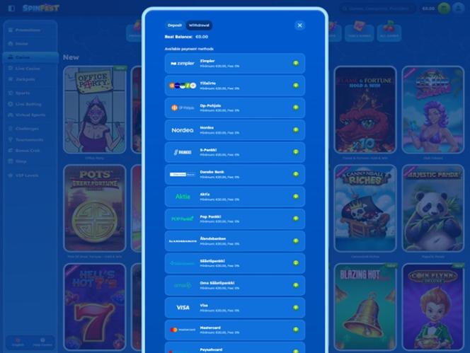 请记住,您可以在网站上查看您所在司法管辖区是否支持某种付款方式,因为网站上有一个付款页面,您可以从下拉菜单中轻松选择您所在的国家/地区和货币。您将看到所有可用的存款和取款选项以及付款方式限额。这是一种简单便捷的方式,可确保您使用首选付款方式,并在 SpinFest Casino 无缝进行交易。