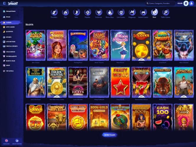 正如我们之前提到的,选择合作伙伴和选择合适的内容对运营商来说是一项艰巨的任务,尤其是在编写在线老虎机版块时。如果您的品牌名称是Spinight,那么对赌场会员的责任就更大了。不过,在这方面完全不用担心——这家赌场提供了丰富的在线老虎机游戏,在我们访问期间,已有超过六千款游戏可供选择。