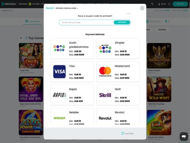 Spinoli 赌场提供各种支付方式,例如 MiFinity、银行电汇、Skrill、Netteler、Visa 和 MasterCard 等等,以及许多加密货币选项,例如比特币、比特币现金、以太坊、莱特币、瑞波币、Tether 和 USD Coin。