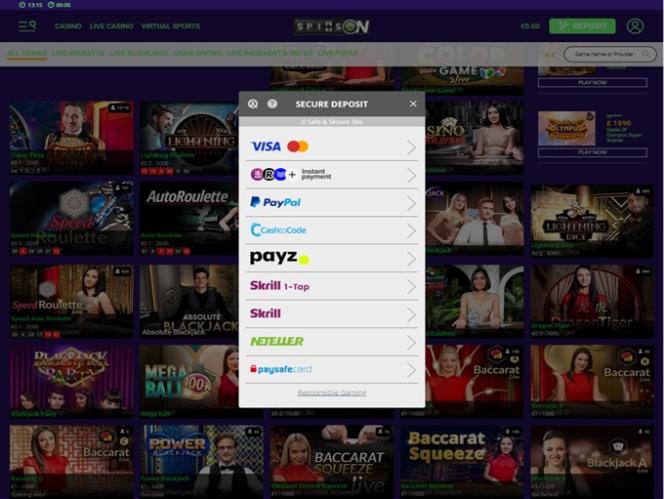 Spinson 由 Microgaming, Net Entertainment, BetSoft, 1x2gaming, Big Time Gaming, Evolution Gaming, EYECON, iSoftBet, lightningboxgames, Oryx, Play'n GO, Quickspin, Yggdrasil, Realistic Games, Booming Games, Stakelogic, Pragmatic Play, GAMING1, Red Tiger Gaming, Red Rake Gaming, Skillzzgaming, SYNOT Games, Skywind, Triple Edge Studios, Northern Lights Gaming, Switch Studios, All41 Studios, Gameburger Studios, Pulse 8 Studios, Neon Valley Studios, SpinPlay Games, HungryBear Gaming, Real Dealer Studios, Buck Stakes Entertainment, Games Global, Wizard Games, bluberi, Blueprint Gaming, NeoGames, Pariplay, Tom Horn Gaming, Inspired Gaming, Gaming Realms, Gamomat, Reel Time Gaming, Bally Wulff, Iron Dog Studio, Old Skool Studios, Foxium, Just For The Win, Reflex Gaming, PearFiction Studios, Wild Streak Gaming, Slingshot Studios, Fortune Factory Studios, 4ThePlayer, AvatarUX, Gamevy, Alchemy Gaming, Snowborn Games, Boomerang Studios, Hacksaw Gaming, Gold Coin Studios, Bang Bang Games, Slotmill, Lucksome Gaming, Area Vegas, Leap Gaming, GoldenRace, Wishbone Games, HammerTime Games, Nailed It! Games, Atomic Slot Lab, Neko Games, Reel Kingdom and Indigo Magic提供支持,其游戏通过基于网络的平台提供,这意味着您可以直接通过互联网浏览器访问赌场。Baccarat