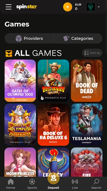 游戏类别包括老虎机、热门新游戏、现场游戏、原创游戏、累积奖金等。如果您对现场赌场部分感兴趣,在这里您会找到玩家最喜欢的顶级游戏。