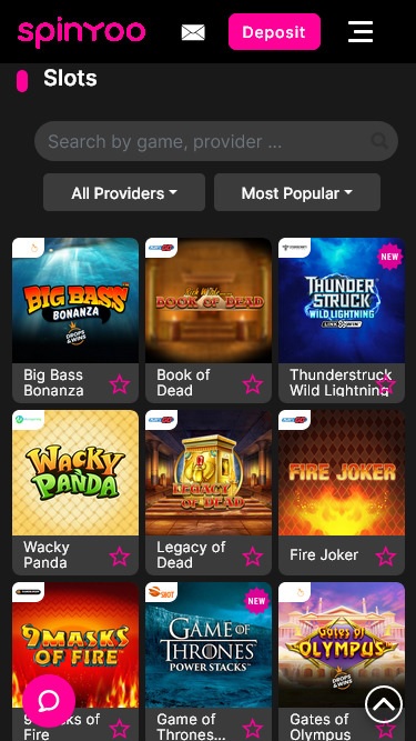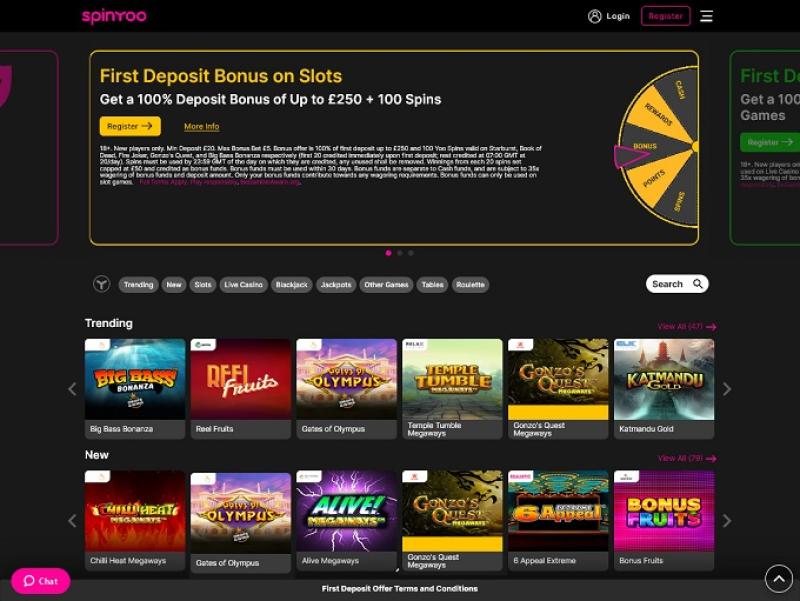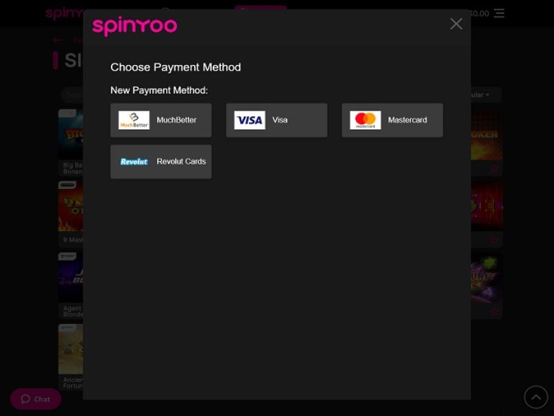 赌场页面布局合理。在线帮助聊天窗口位于左下角,主菜单位于页眉右侧。SpinYoo 的实用信息遍布整个网站。