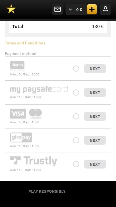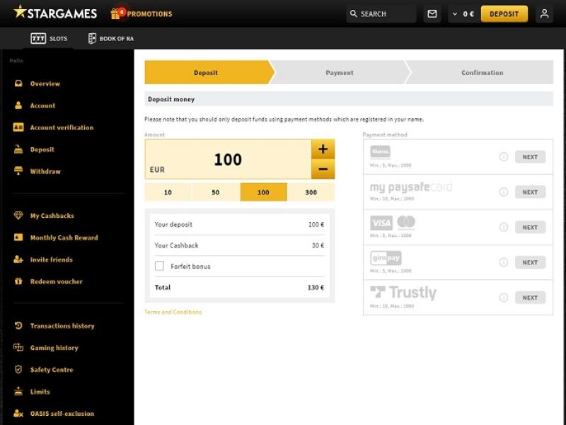 浏览星光赌场 (Star Games Casino) 的条款和条件,没有任何明显的不公平或掠夺性条款。星光赌场的银行系统非常完善,赌场支持通过美国运通卡 (American Express)、电汇、Click2Pay、iDeal、Maestro、万事达卡 (MasterCard)、Skrill、Neteller、PayPal、Paysafecard、Visa、SOFORT Banking、GiroPay 等多种方式进行交易。赌场会立即支付电子钱包奖金,而信用卡和借记卡付款则可能需要长达 24 小时才能处理。银行电汇付款可能需要 2 到 5 个工作日。需要注意的是,这家赌场每月的提款限额为 3,000 欧元。
