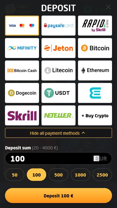 Stay Casino 是一家多元化、多边的在线游戏平台,成立于 2021 年。其使命是专注于娱乐和赢取最佳礼品,同时让每位会员都能放松身心,沉浸在真实赌场的氛围中。所有货币或支付方式的提现时间均不超过 10 分钟,快速安全,建议玩家尽快提取奖金。平台上有超过 4000 款游戏,涵盖老虎机、纸牌游戏、轮盘赌和真人荷官等多种游戏,并提供 24/7 全天候在线聊天和客服支持。