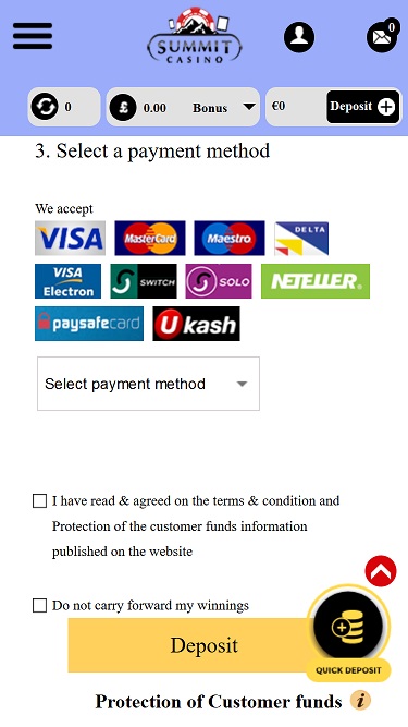Summit Casino 的条款和条件中没有任何不公平或掠夺性的内容。Summit Casino 的银行系统比我预期的要慢一些,支付时间可能需要 7 到 10 个工作日。在英国这样一个竞争激烈的市场,这实在是太慢了,我希望速度问题能尽快得到解决。提款和存款可以通过 Visa、Maestro、Solo 和 Neteller 进行,存款也可以通过 Boku、Paysafecard 和 MasterCard 进行。提款也可以通过支票或银行电汇支付。Banking银⾏业务选项 的 Summit Casino