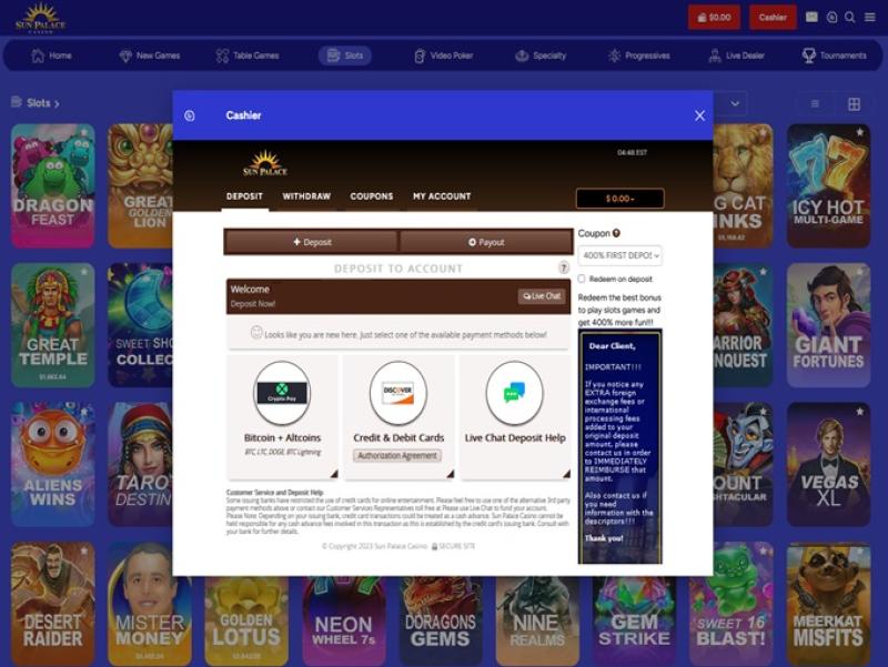 Sun Palace 赌场自 2002 年成立以来,是哥斯达黎加最优秀的赌场运营商之一。其母公司 Mainstreet Vegas 集团推出了一系列优秀的在线赌场,包括 Slots Plus、Las Vegas USA Casino 和 Vegas Casino Online。过去十年来,Sun Palace 一直以可靠的支付方式和为美国客户提供丰富的支付处理选项而备受赞誉。