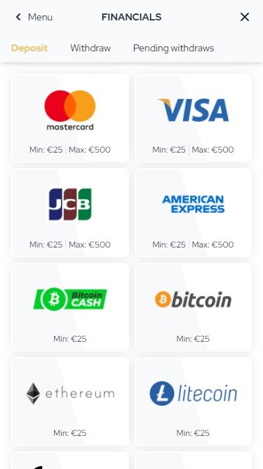正如我们已经提到的,这个博彩品牌支持加密货币。当然,它也提供标准支付方式。