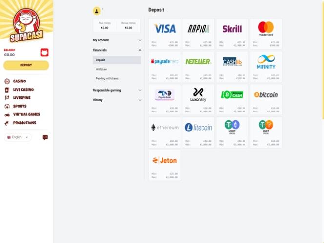 Banking银⾏业务选项 的 Supacasi Casino
