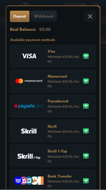 赌场的出纳员支持多种传统和加密货币支付方式。请注意,可用的选项取决于您所在的国家/地区,但无论您身在哪个博彩管辖区,都有多种流行的存款和取款方式可供选择。银行页面包含一个下拉菜单,您可以在其中选择您所在的国家/地区和货币,以查看您所在地区所有可用的选项,并明确规定了每种选项的限额。